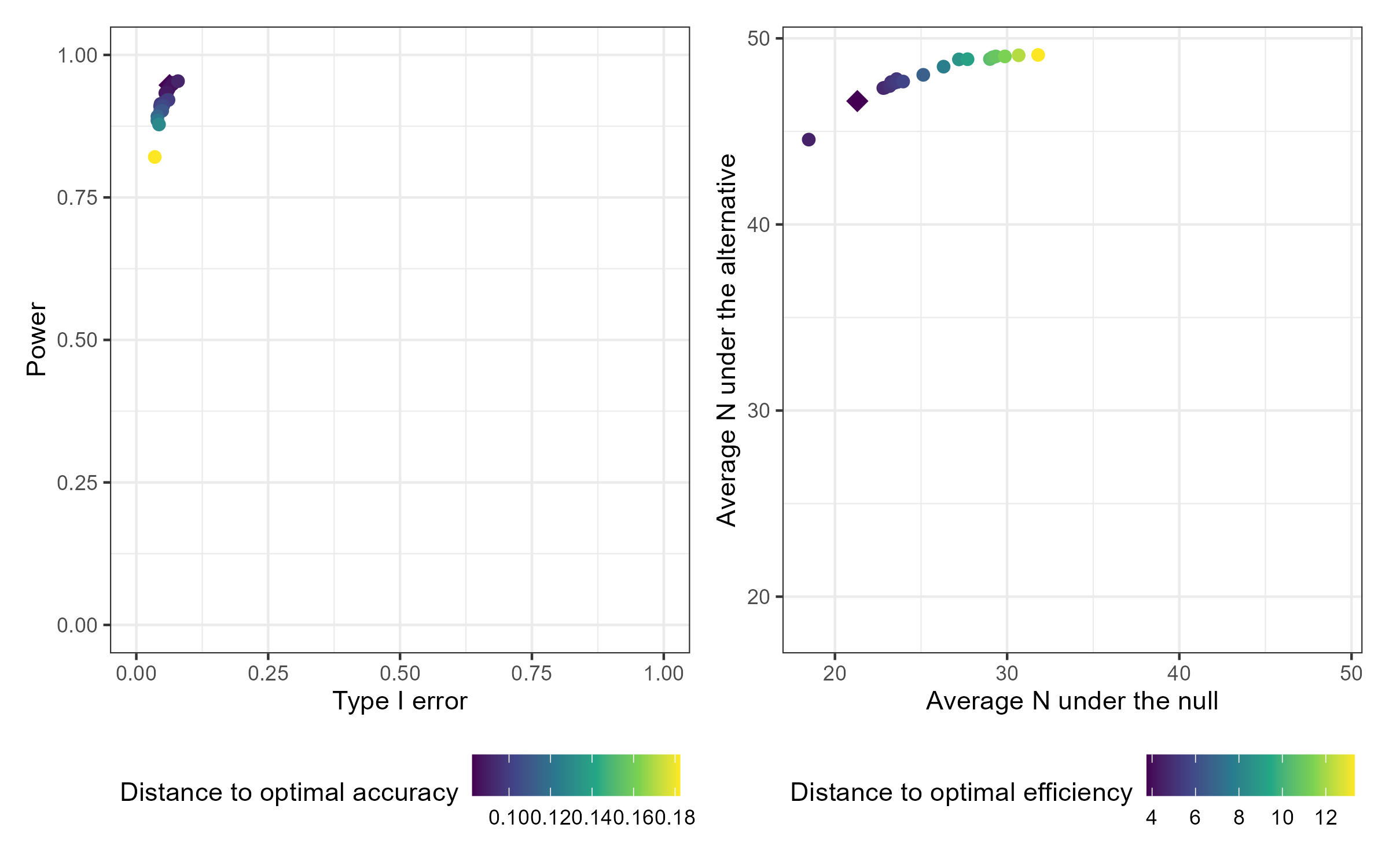 The optimal accuracy and optimal efficiency designs can be obtained by passing the results to the optimize_design() function, with filtering applied for the desired range of type 1 error and minimum power.