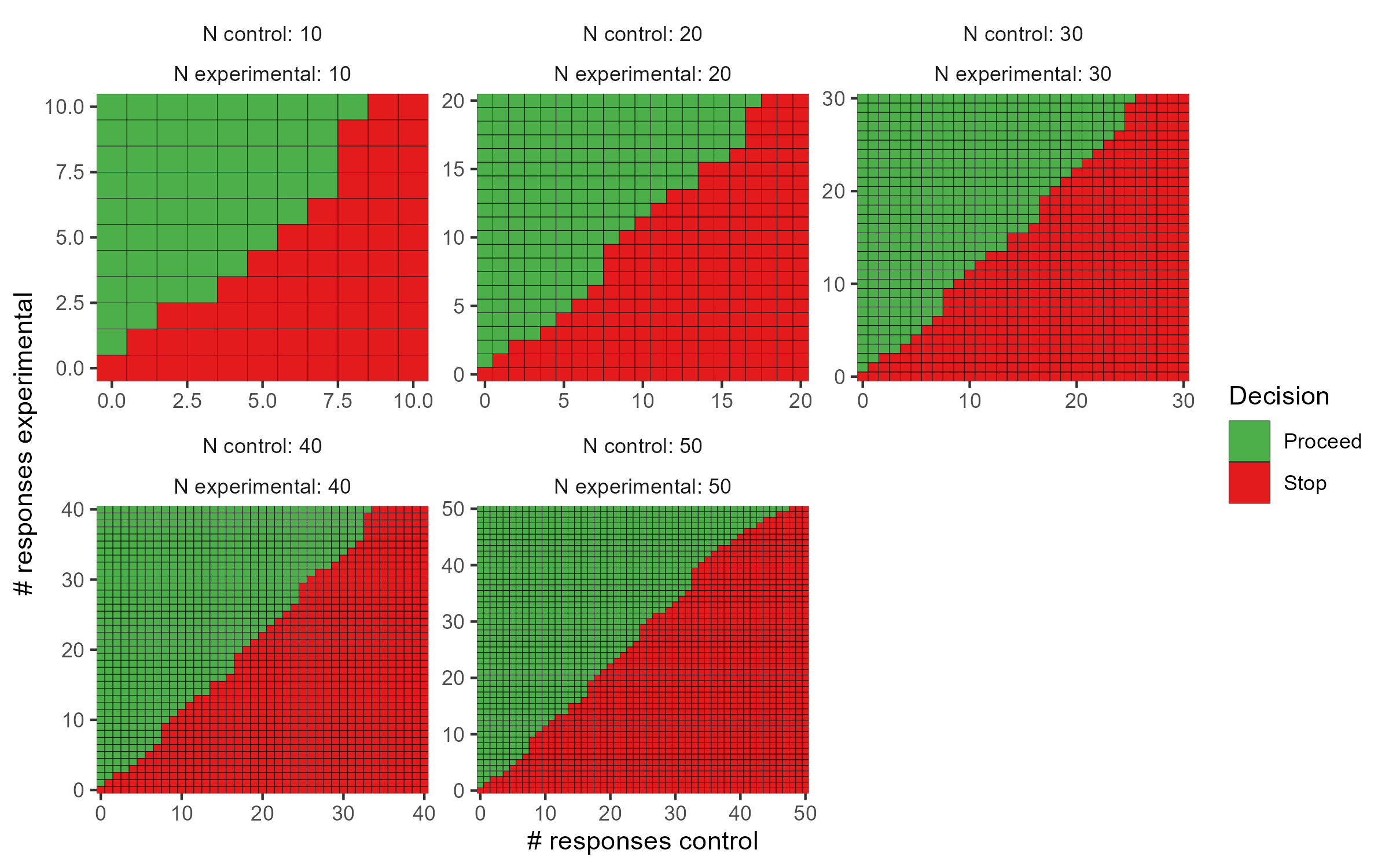 After selecting a design, we can obtain a set of decision rules to implement the trial, so that no calculations will be needed during the course of the trial. The calc_decision_rules() function will generate the decision rules to stop or continue at each interim look of the trial.