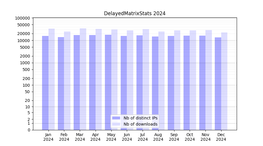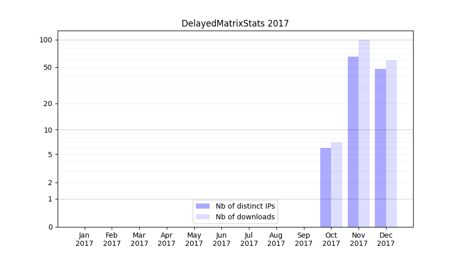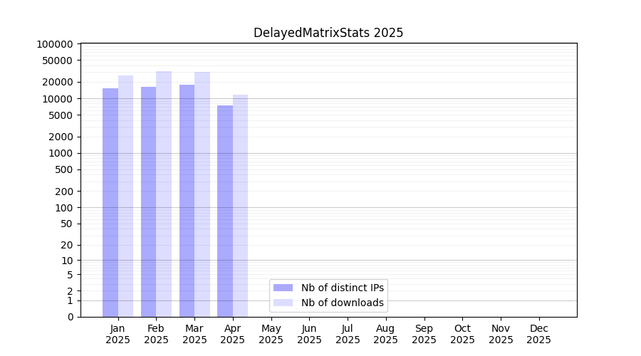 Number of downloads for software package DelayedMatrixStats, year by year, from 2025 back to 2014 (years with no downloads are omitted):