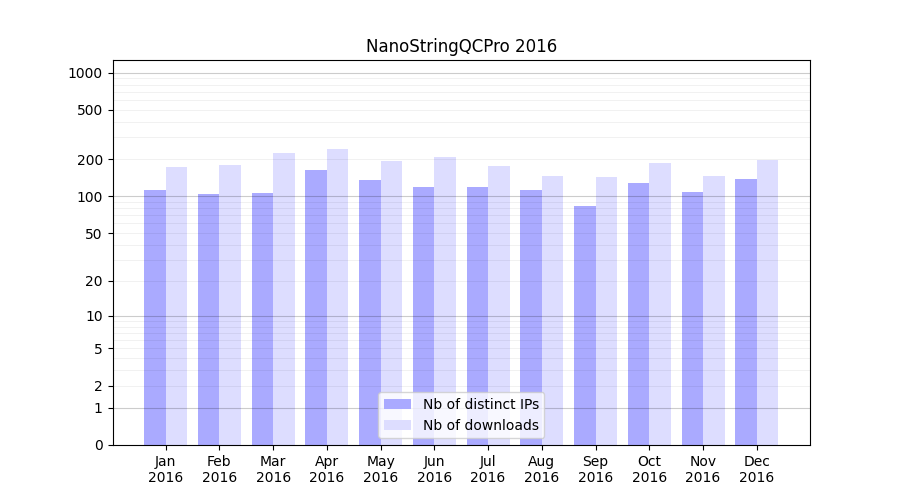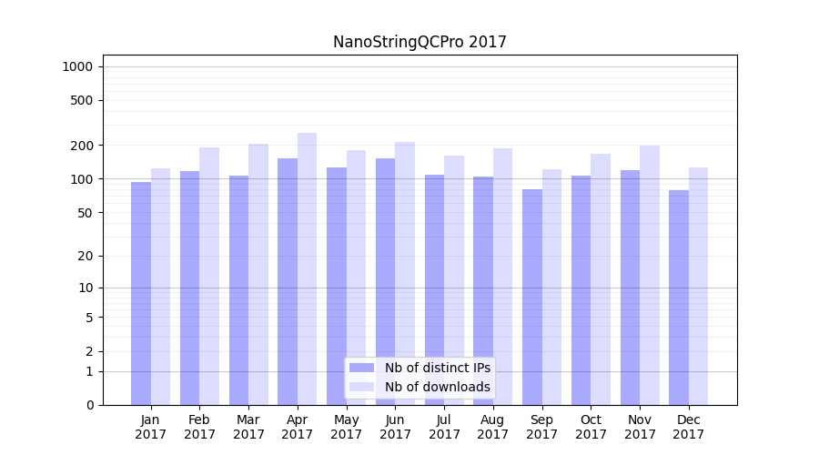 Number of downloads for software package NanoStringQCPro, year by year, from 2025 back to 2014 (years with no downloads are omitted):