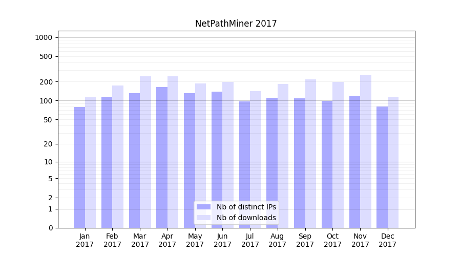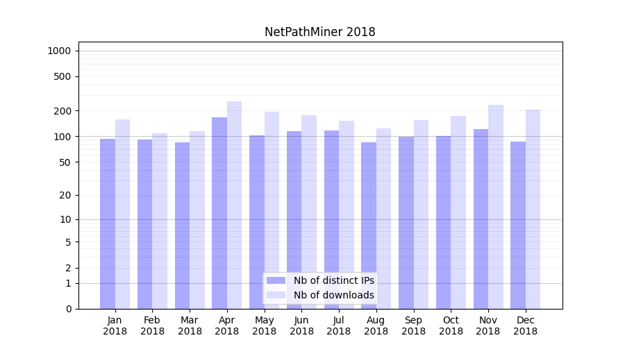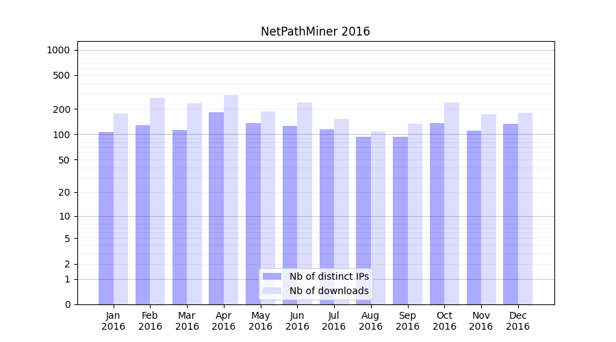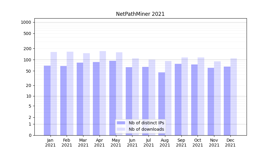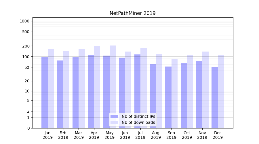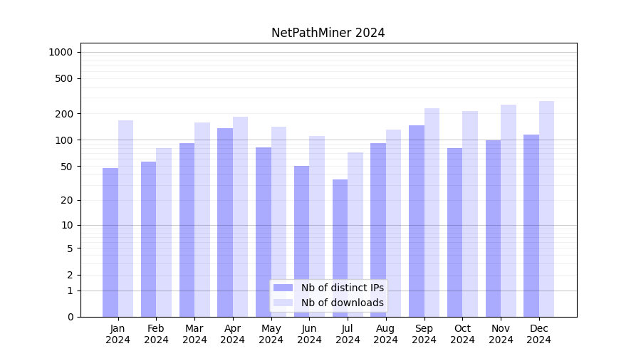Number of downloads for software package NetPathMiner, year by year, from 2025 back to 2014 (years with no downloads are omitted):