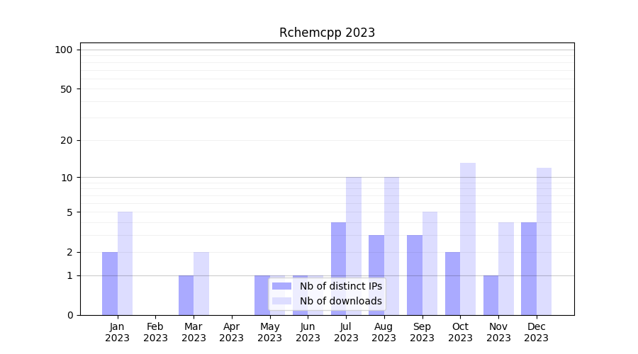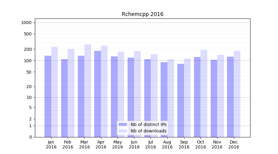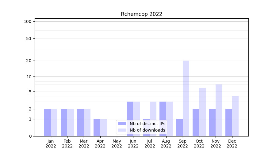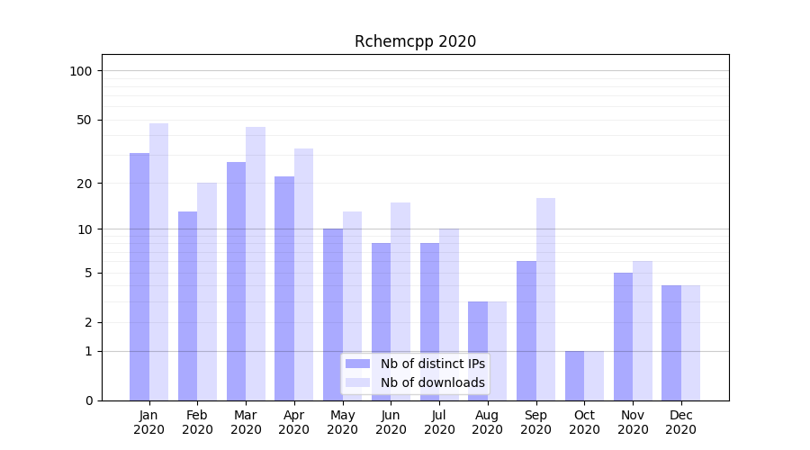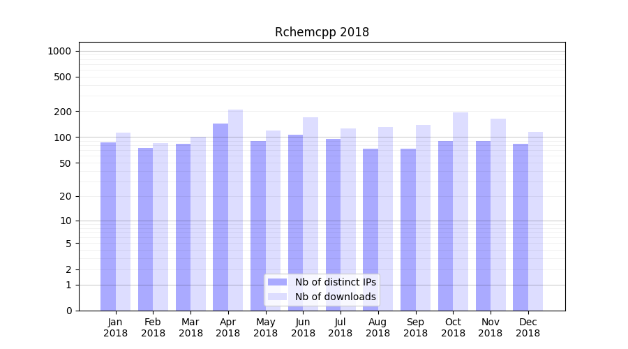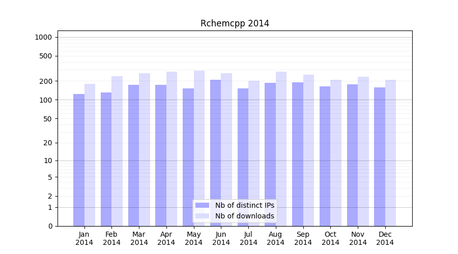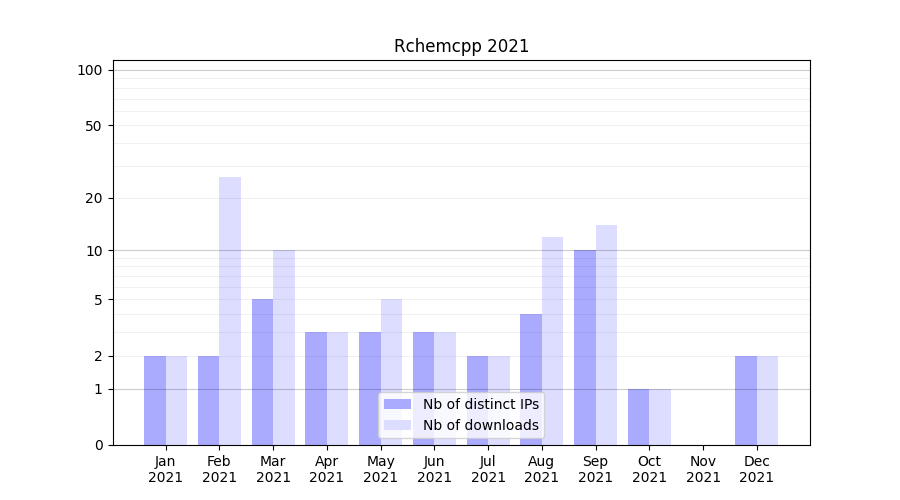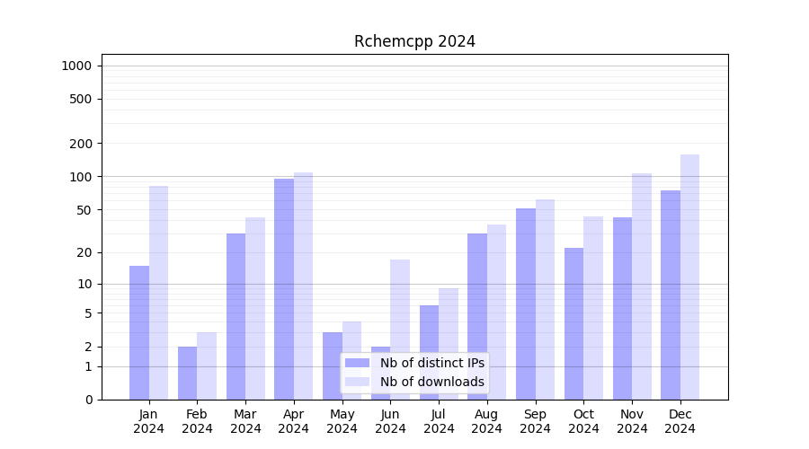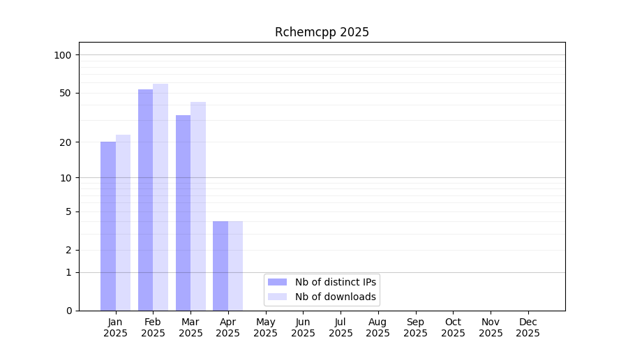 Number of downloads for software package Rchemcpp, year by year, from 2025 back to 2014 (years with no downloads are omitted):