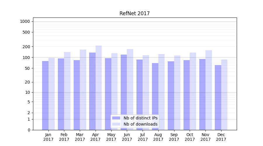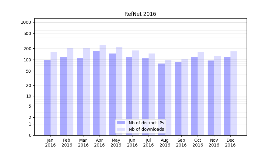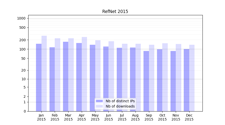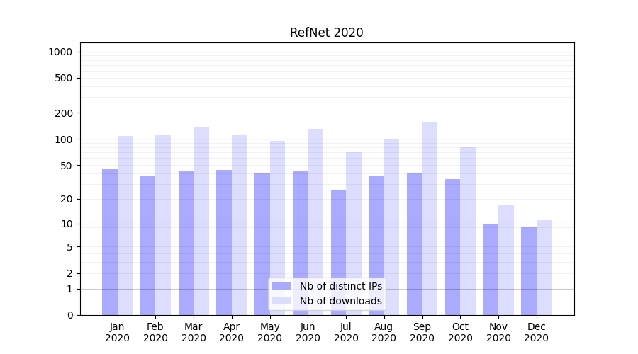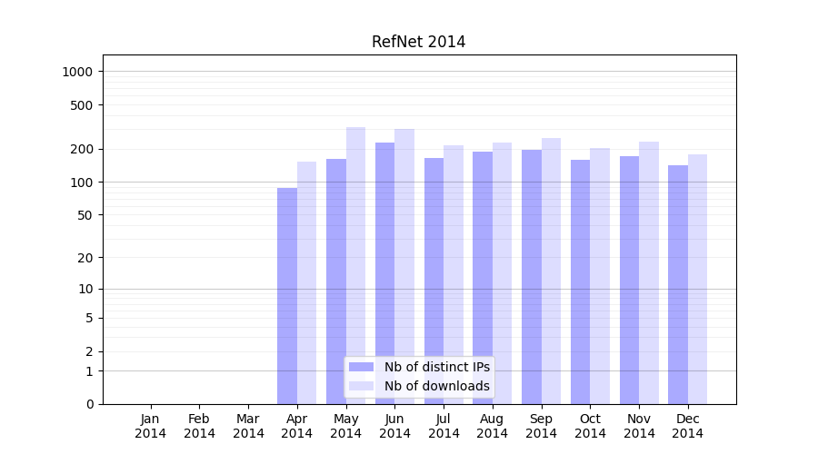 Number of downloads for software package RefNet, year by year, from 2025 back to 2014 (years with no downloads are omitted):