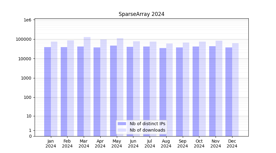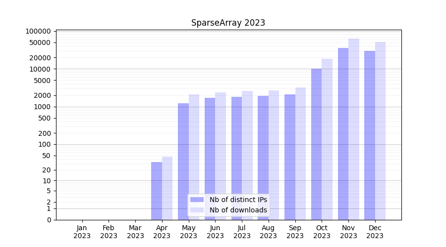 Number of downloads for software package SparseArray, year by year, from 2025 back to 2014 (years with no downloads are omitted):