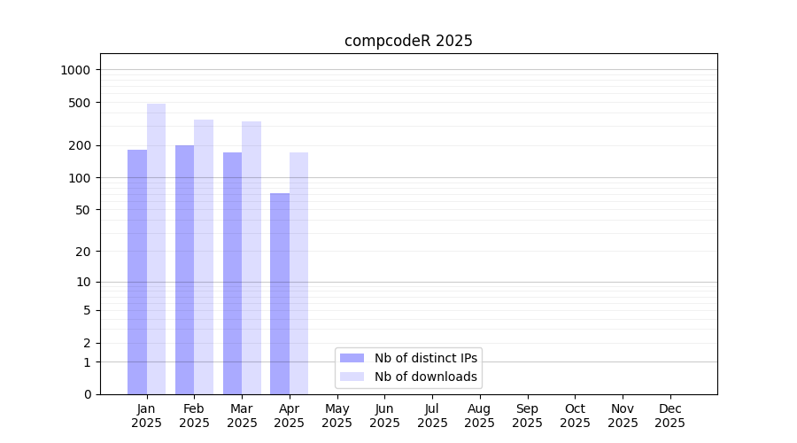 Number of downloads for software package compcodeR, year by year, from 2025 back to 2014 (years with no downloads are omitted):