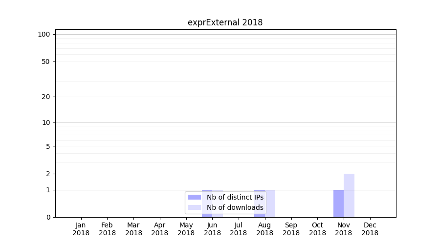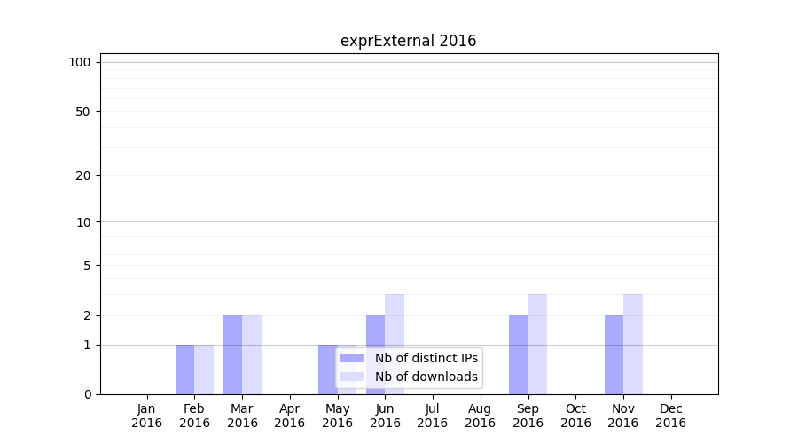 Number of downloads for software package exprExternal, year by year, from 2025 back to 2014 (years with no downloads are omitted):