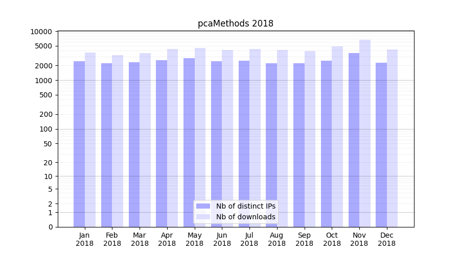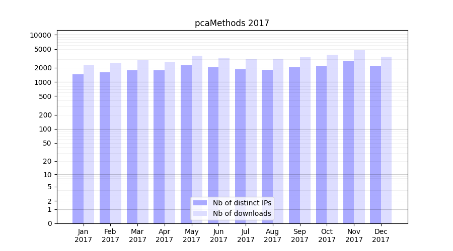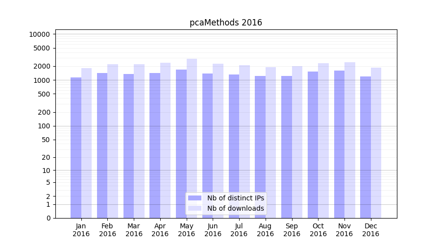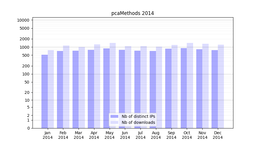 Number of downloads for software package pcaMethods, year by year, from 2025 back to 2014 (years with no downloads are omitted):