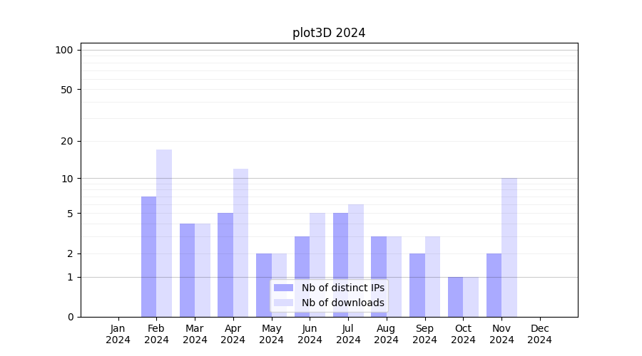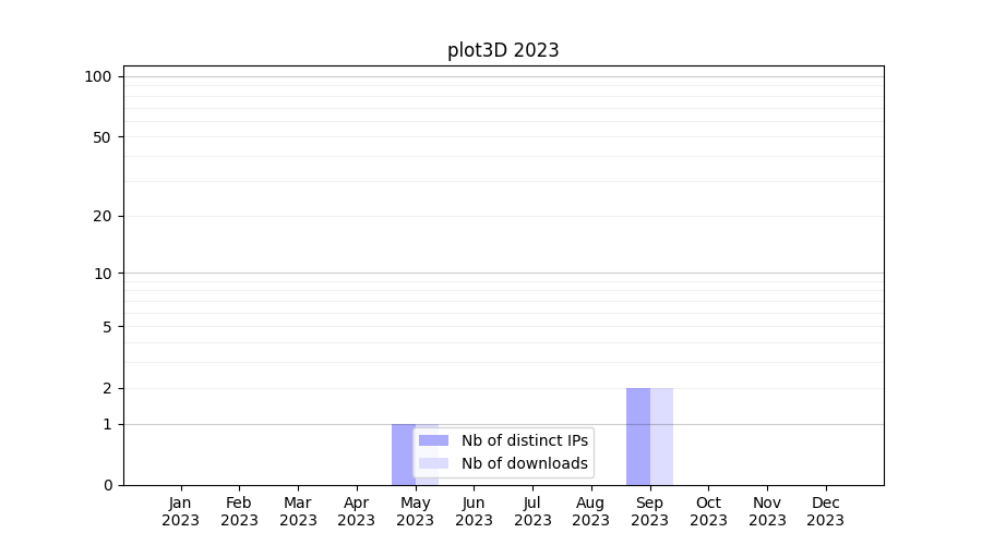Number of downloads for software package plot3D, year by year, from 2025 back to 2014 (years with no downloads are omitted):
