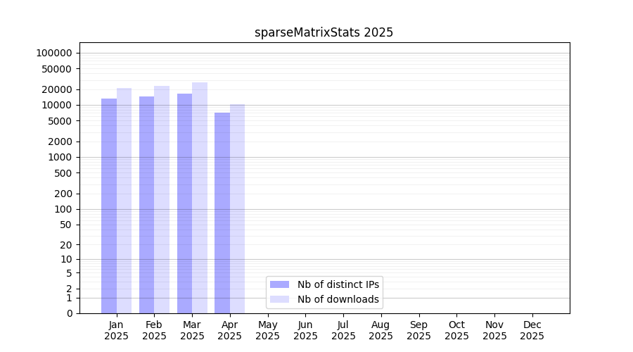 Number of downloads for software package sparseMatrixStats, year by year, from 2025 back to 2014 (years with no downloads are omitted):