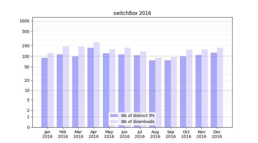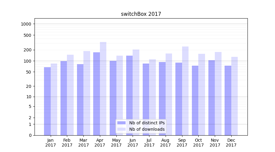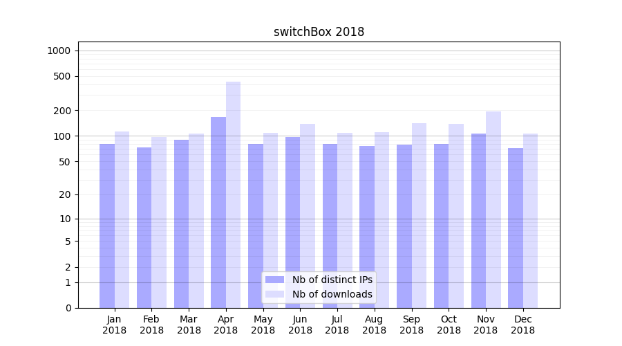 Number of downloads for software package switchBox, year by year, from 2025 back to 2014 (years with no downloads are omitted):