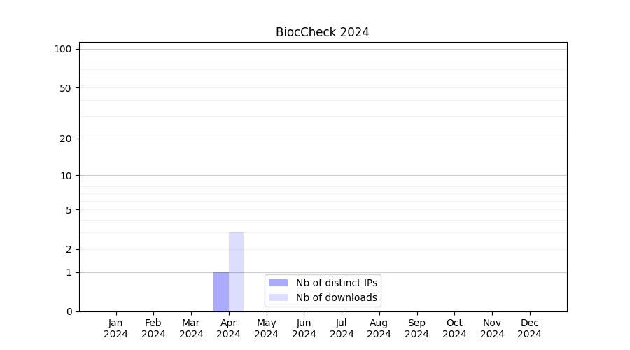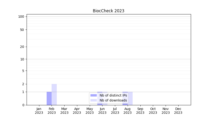 Number of downloads for annotation package BiocCheck, year by year, from 2025 back to 2014 (years with no downloads are omitted):