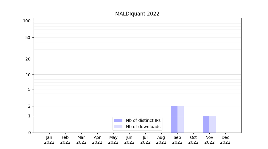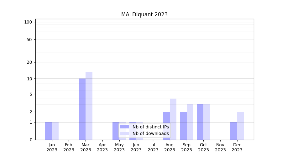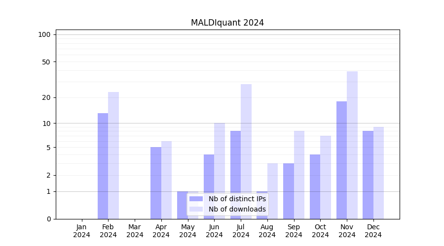 Number of downloads for annotation package MALDIquant, year by year, from 2025 back to 2014 (years with no downloads are omitted):