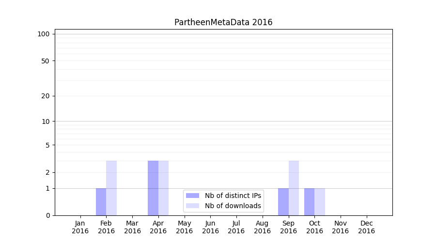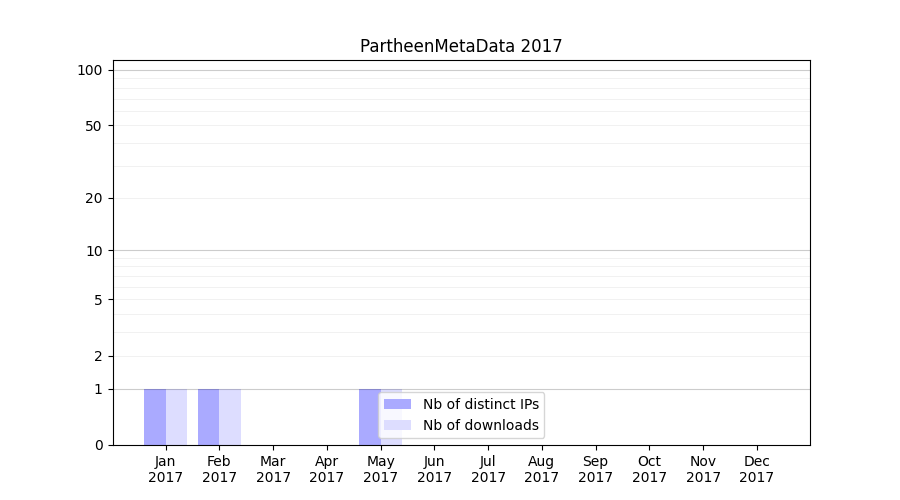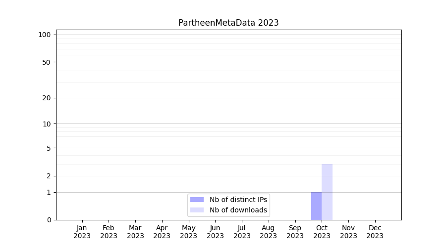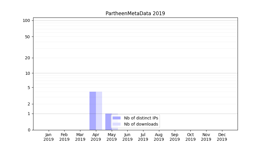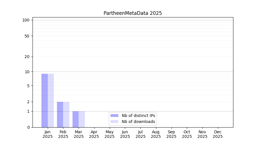 Number of downloads for annotation package PartheenMetaData, year by year, from 2025 back to 2014 (years with no downloads are omitted):