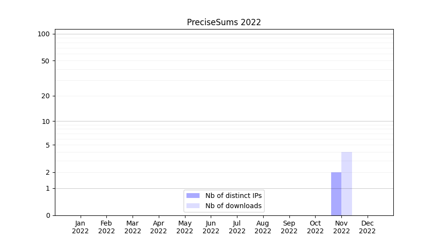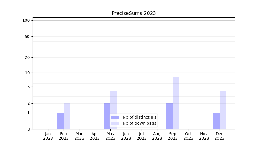 Number of downloads for annotation package PreciseSums, year by year, from 2025 back to 2014 (years with no downloads are omitted):