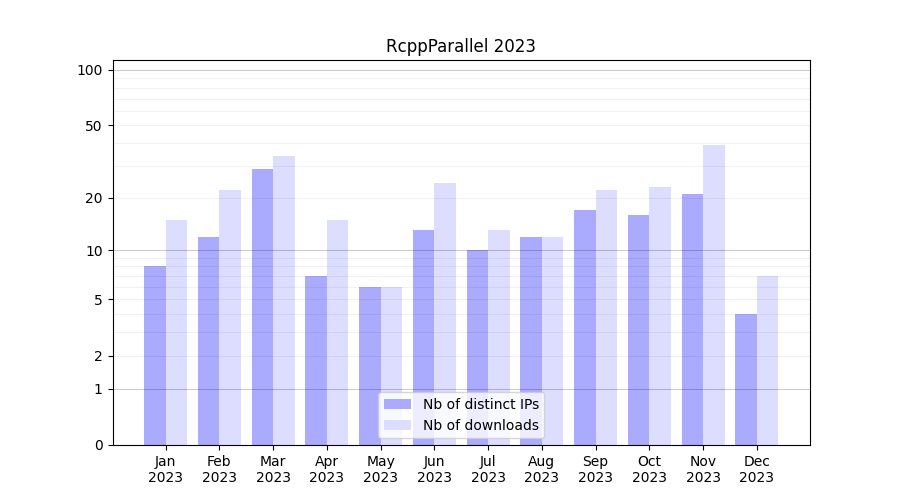Number of downloads for annotation package RcppParallel, year by year, from 2025 back to 2014 (years with no downloads are omitted):