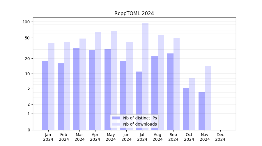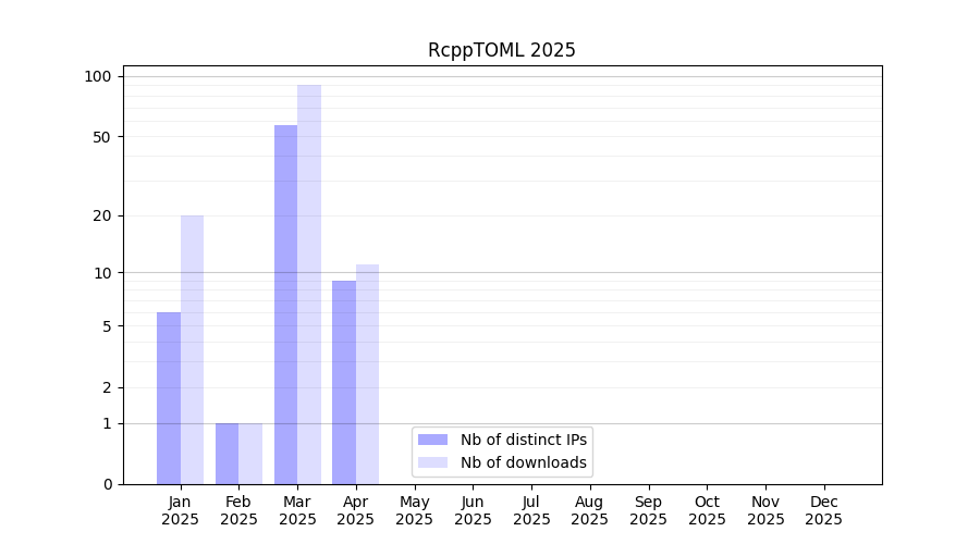 Number of downloads for annotation package RcppTOML, year by year, from 2025 back to 2014 (years with no downloads are omitted):