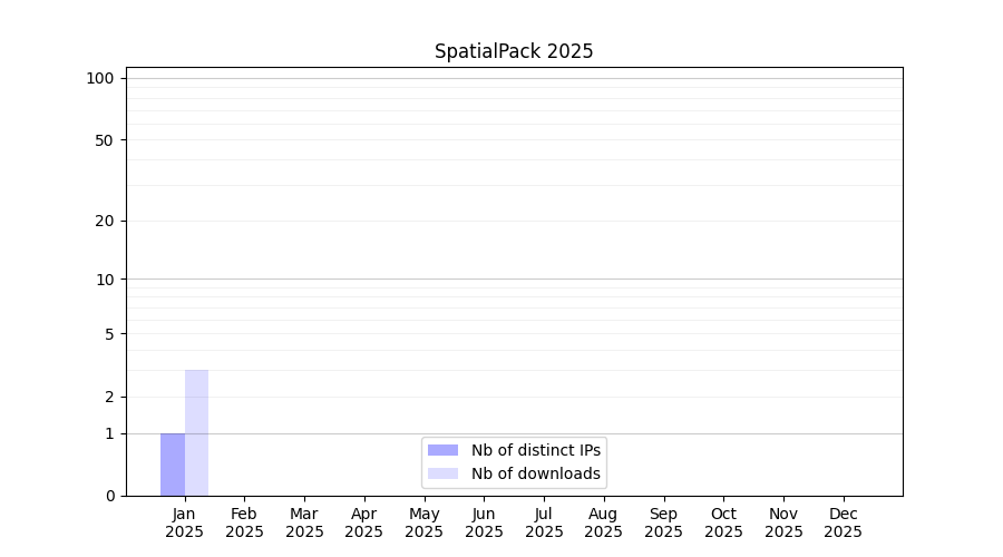 Number of downloads for annotation package SpatialPack, year by year, from 2025 back to 2014 (years with no downloads are omitted):