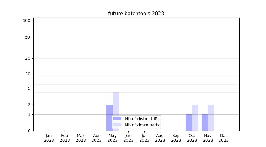 Number of downloads for annotation package future.batchtools, year by year, from 2025 back to 2014 (years with no downloads are omitted):