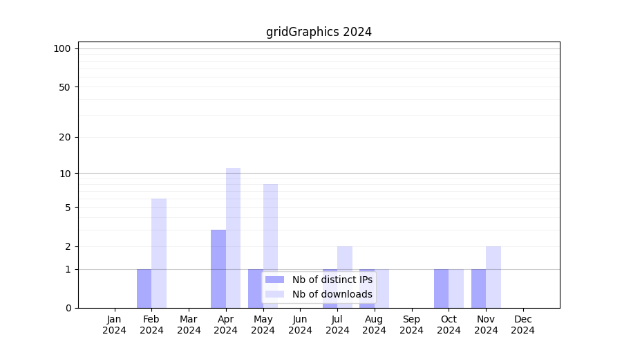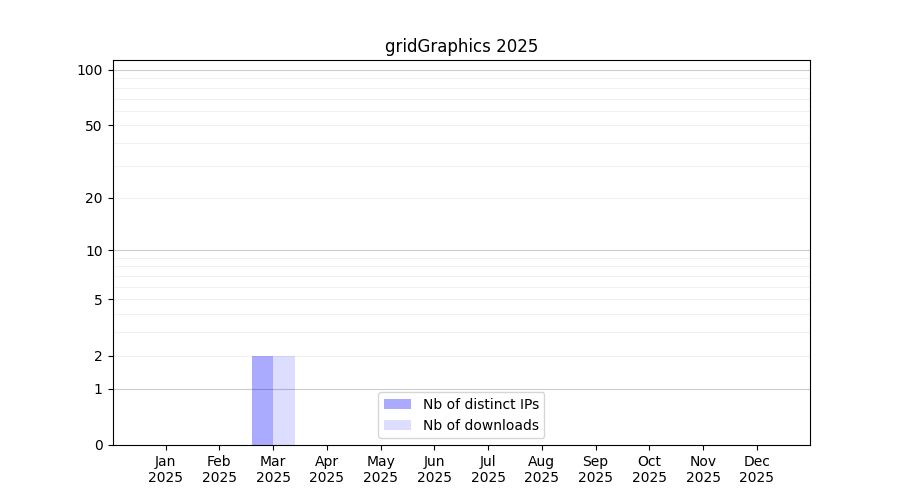 Number of downloads for annotation package gridGraphics, year by year, from 2025 back to 2014 (years with no downloads are omitted):