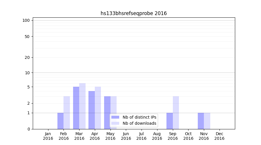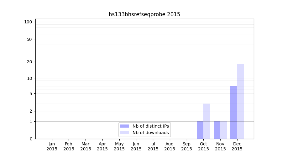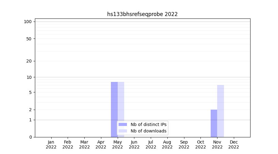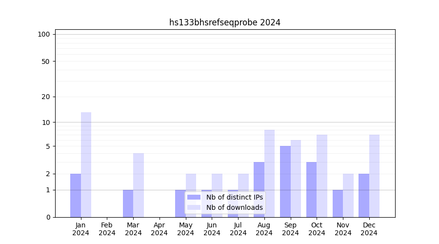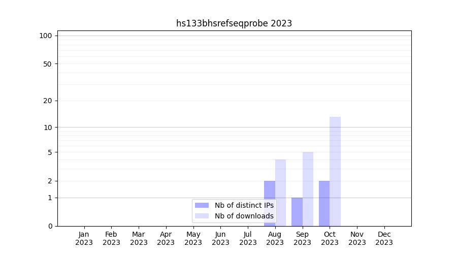 Number of downloads for annotation package hs133bhsrefseqprobe, year by year, from 2025 back to 2014 (years with no downloads are omitted):
