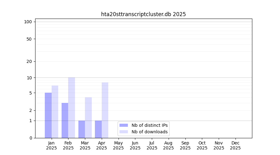 Number of downloads for annotation package hta20sttranscriptcluster.db, year by year, from 2025 back to 2014 (years with no downloads are omitted):