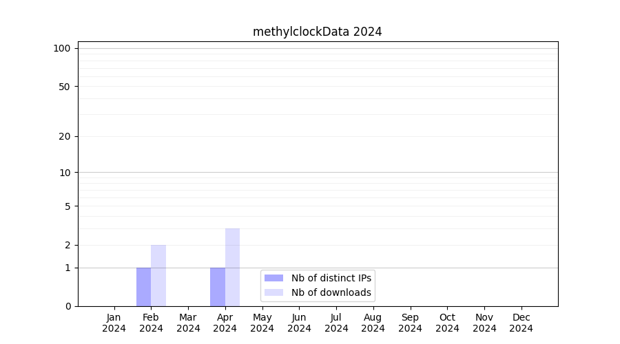 Number of downloads for annotation package methylclockData, year by year, from 2025 back to 2014 (years with no downloads are omitted):