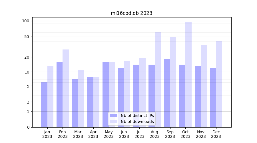 Number of downloads for annotation package mi16cod.db, year by year, from 2025 back to 2014 (years with no downloads are omitted):