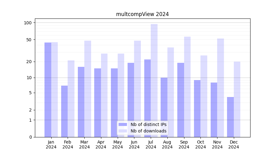 Number of downloads for annotation package multcompView, year by year, from 2025 back to 2014 (years with no downloads are omitted):