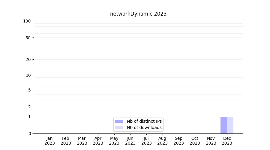 Number of downloads for annotation package networkDynamic, year by year, from 2025 back to 2014 (years with no downloads are omitted):