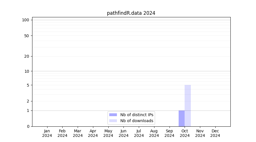Number of downloads for annotation package pathfindR.data, year by year, from 2025 back to 2014 (years with no downloads are omitted):