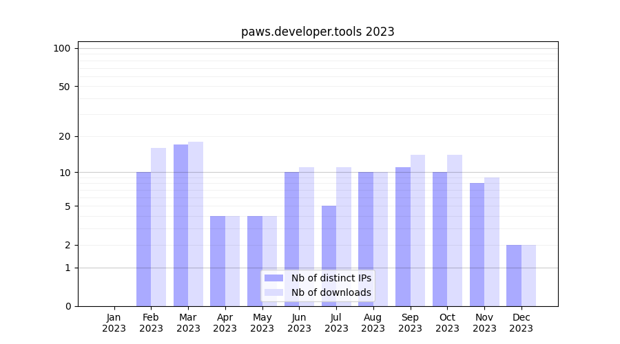 Number of downloads for annotation package paws.developer.tools, year by year, from 2025 back to 2014 (years with no downloads are omitted):