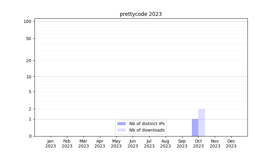 Number of downloads for annotation package prettycode, year by year, from 2025 back to 2014 (years with no downloads are omitted):