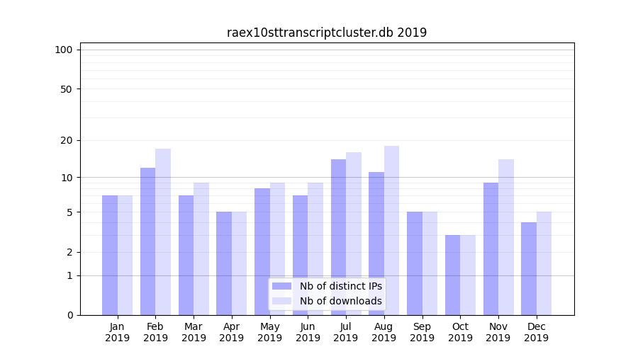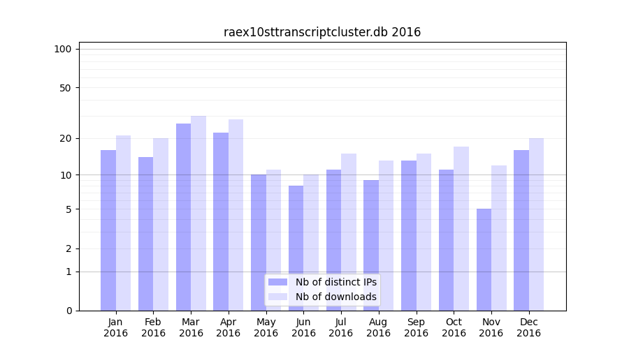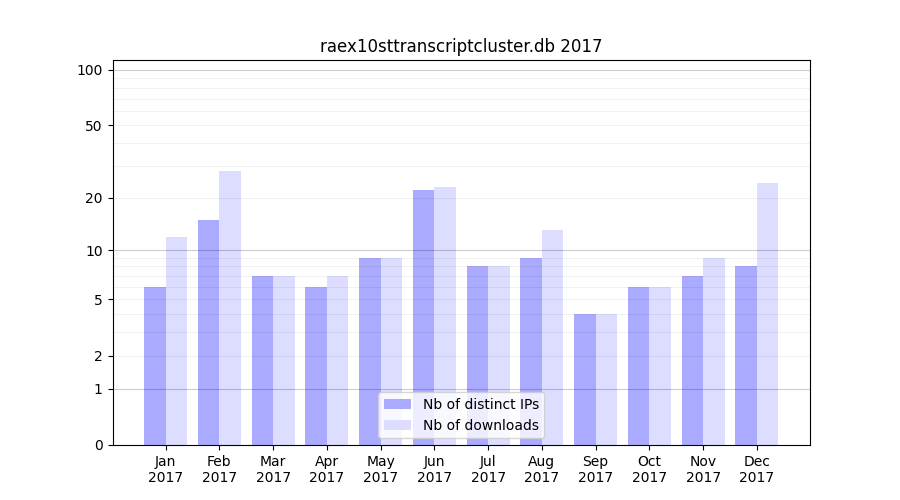 Number of downloads for annotation package raex10sttranscriptcluster.db, year by year, from 2025 back to 2014 (years with no downloads are omitted):