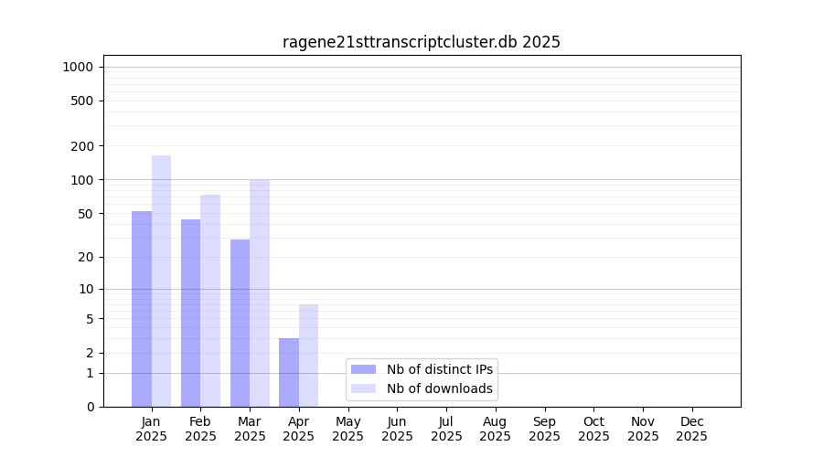 Number of downloads for annotation package ragene21sttranscriptcluster.db, year by year, from 2025 back to 2014 (years with no downloads are omitted):