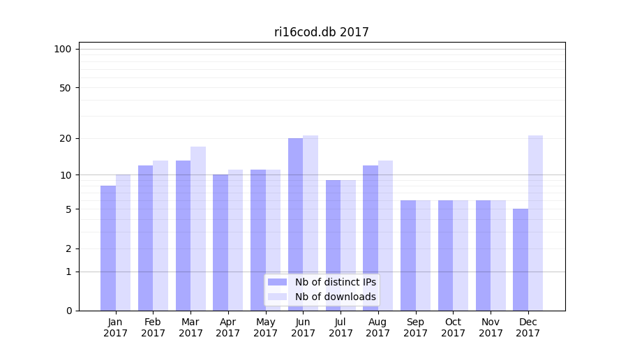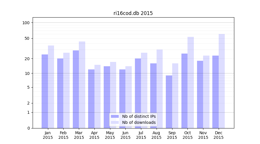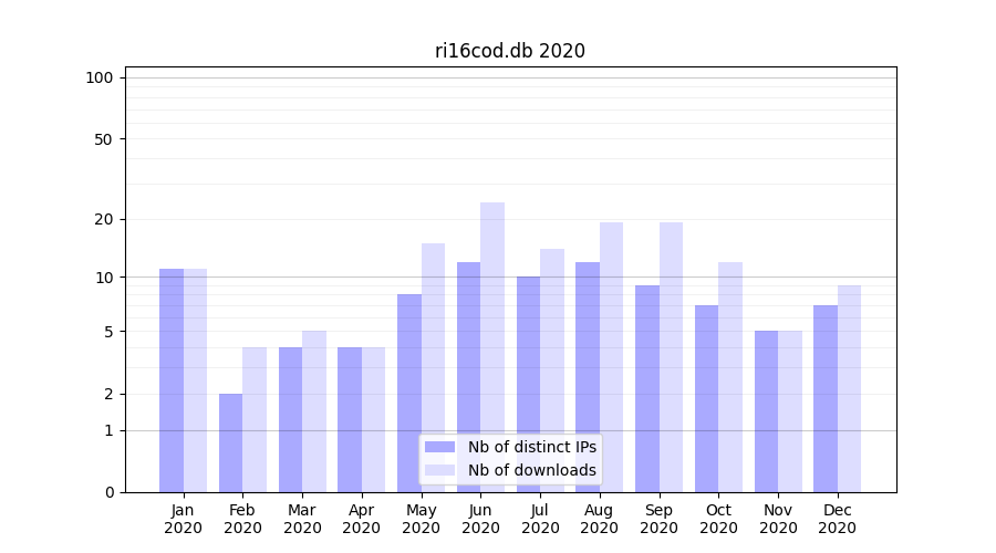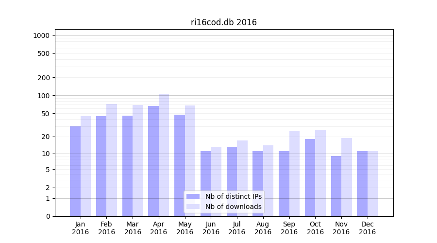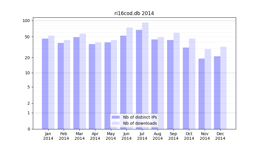 Number of downloads for annotation package ri16cod.db, year by year, from 2025 back to 2014 (years with no downloads are omitted):