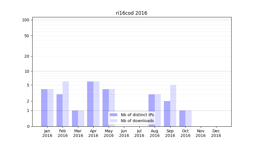 Number of downloads for annotation package ri16cod, year by year, from 2025 back to 2014 (years with no downloads are omitted):