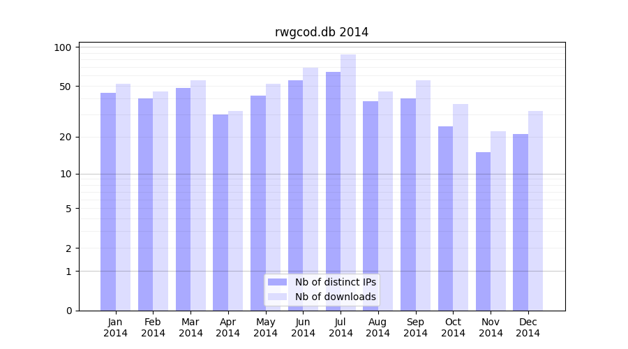Number of downloads for annotation package rwgcod.db, year by year, from 2025 back to 2014 (years with no downloads are omitted):
