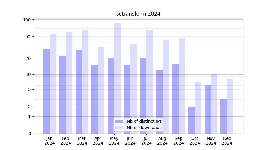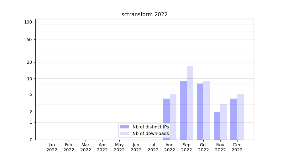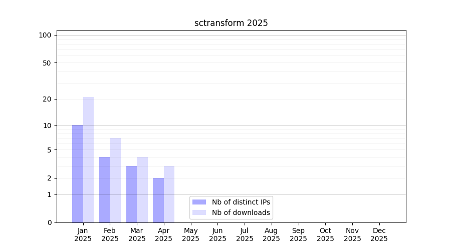 Number of downloads for annotation package sctransform, year by year, from 2025 back to 2014 (years with no downloads are omitted):