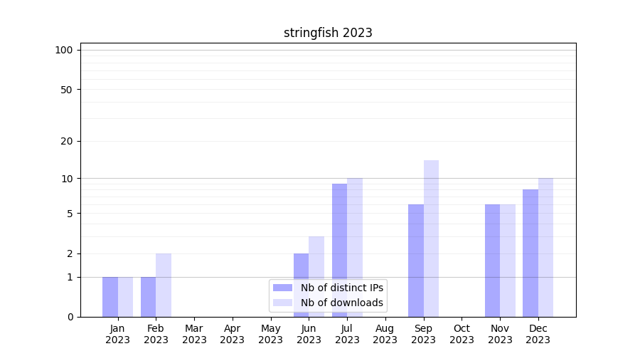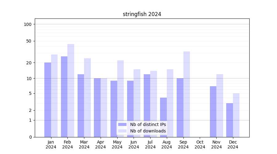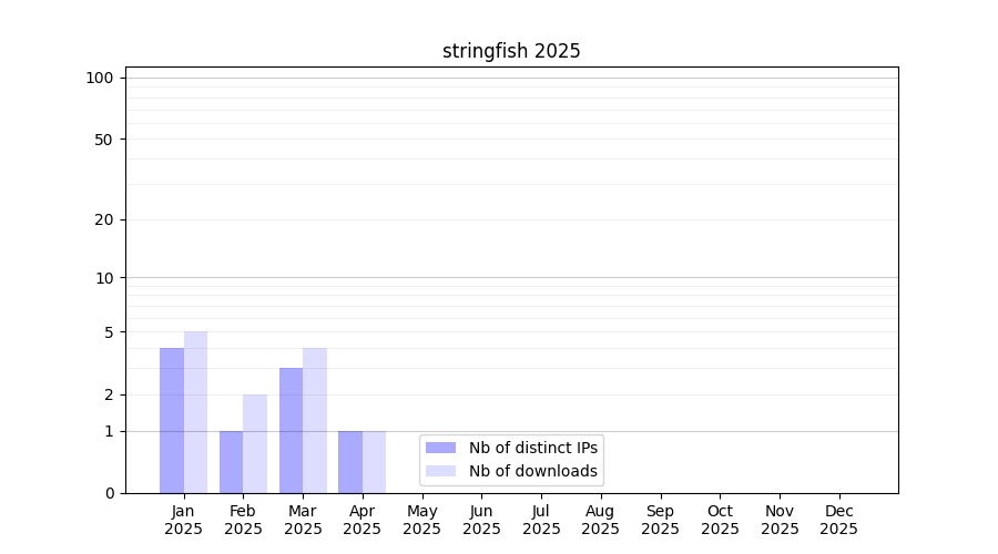 Number of downloads for annotation package stringfish, year by year, from 2025 back to 2014 (years with no downloads are omitted):