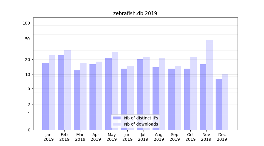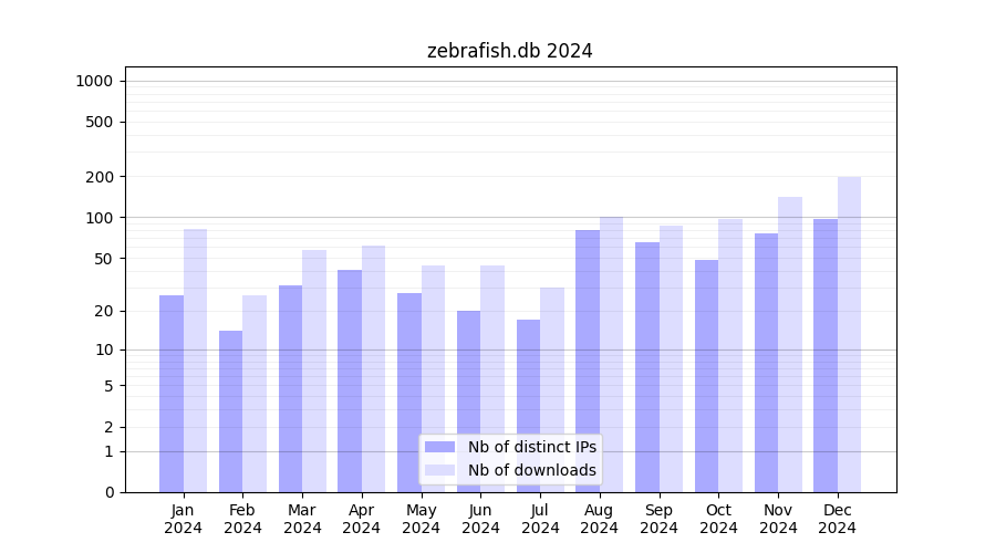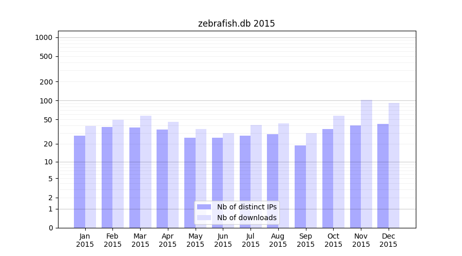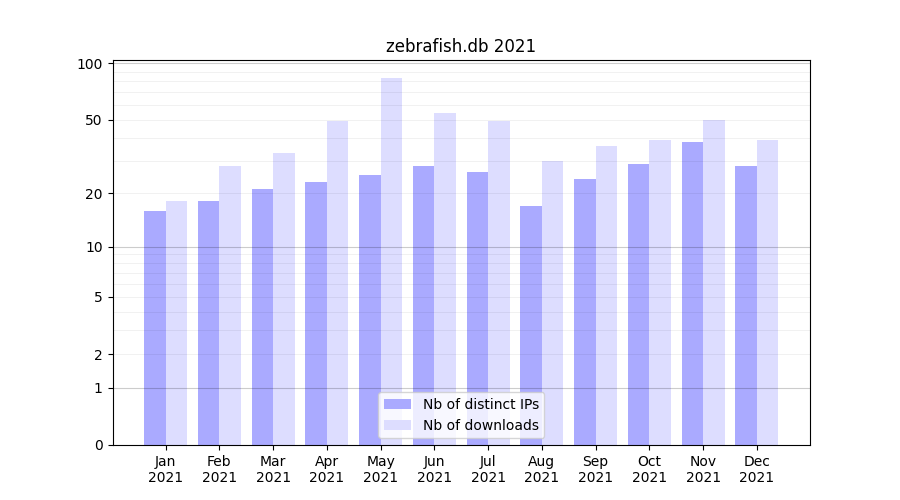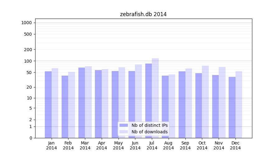 Number of downloads for annotation package zebrafish.db, year by year, from 2025 back to 2014 (years with no downloads are omitted):