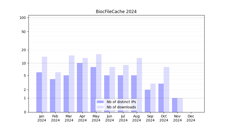 Number of downloads for experiment package BiocFileCache, year by year, from 2025 back to 2014 (years with no downloads are omitted):