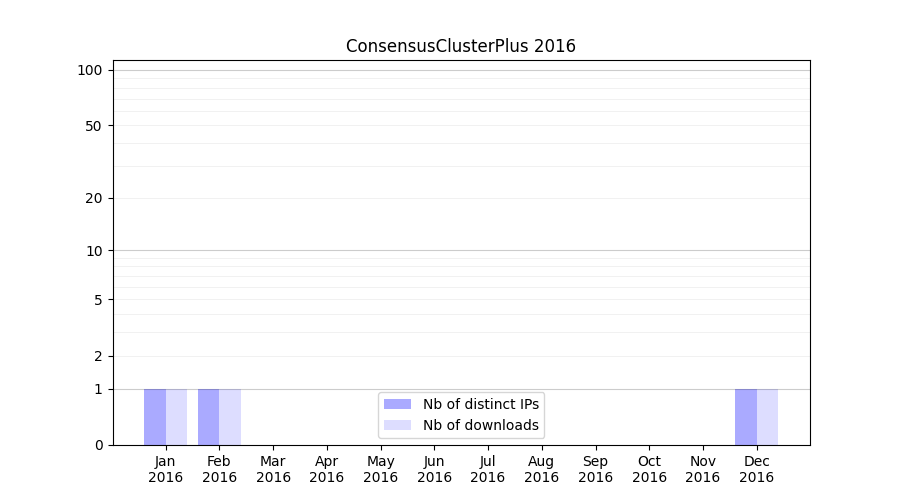 Number of downloads for experiment package ConsensusClusterPlus, year by year, from 2025 back to 2014 (years with no downloads are omitted):
