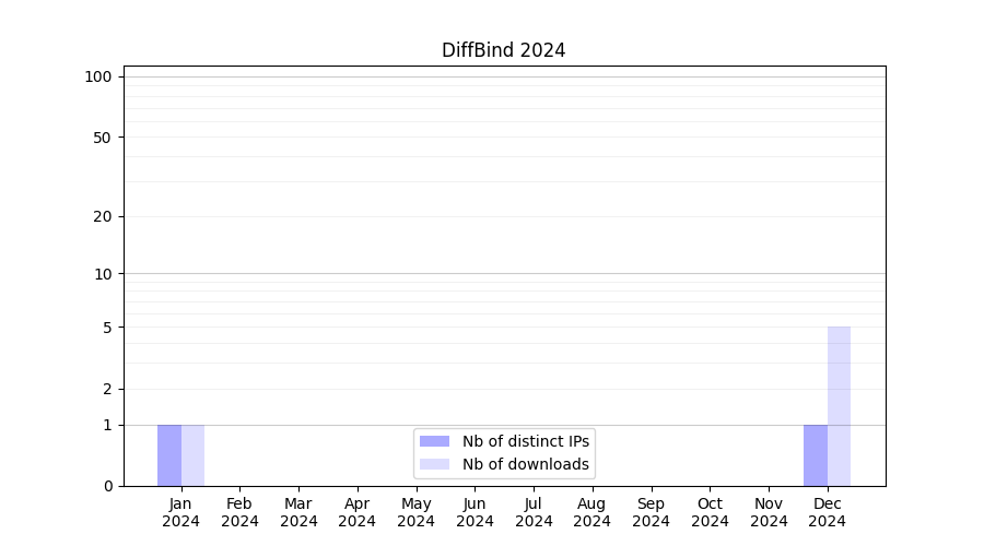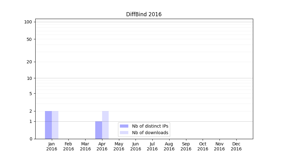 Number of downloads for experiment package DiffBind, year by year, from 2025 back to 2014 (years with no downloads are omitted):