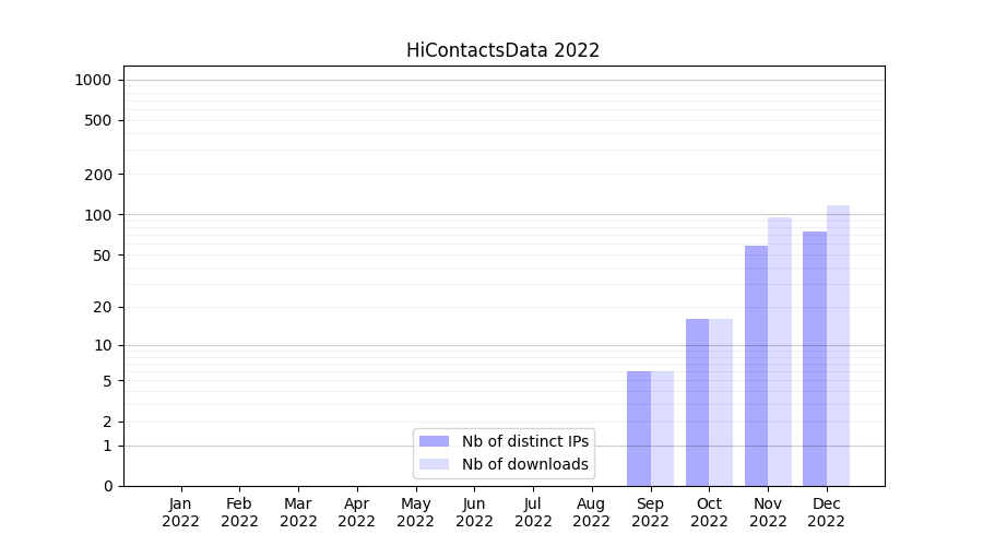 Number of downloads for experiment package HiContactsData, year by year, from 2025 back to 2014 (years with no downloads are omitted):