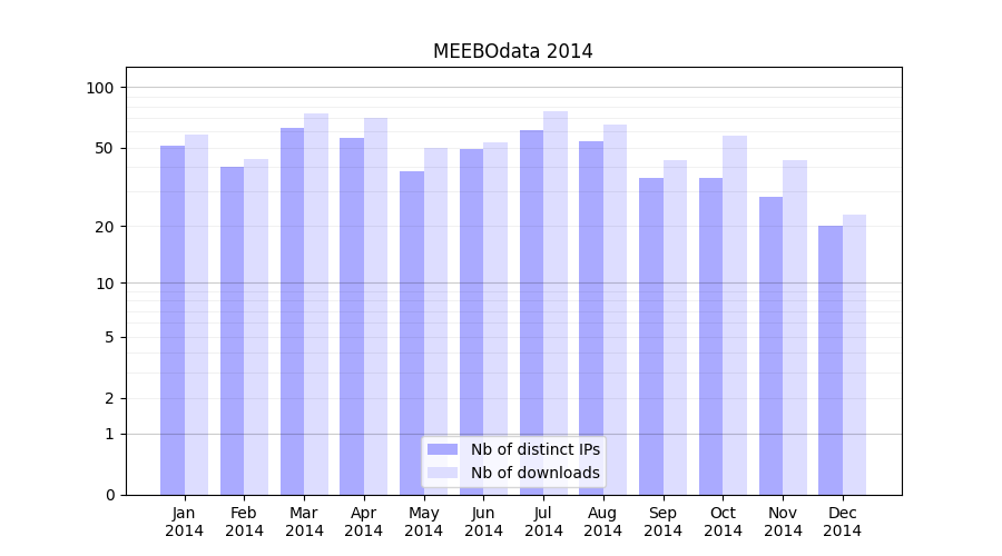 Number of downloads for experiment package MEEBOdata, year by year, from 2025 back to 2014 (years with no downloads are omitted):
