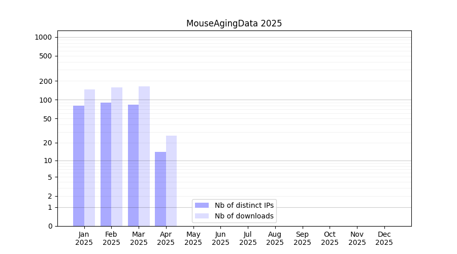 Number of downloads for experiment package MouseAgingData, year by year, from 2025 back to 2014 (years with no downloads are omitted):