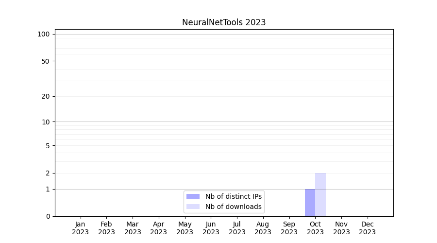 Number of downloads for experiment package NeuralNetTools, year by year, from 2025 back to 2014 (years with no downloads are omitted):