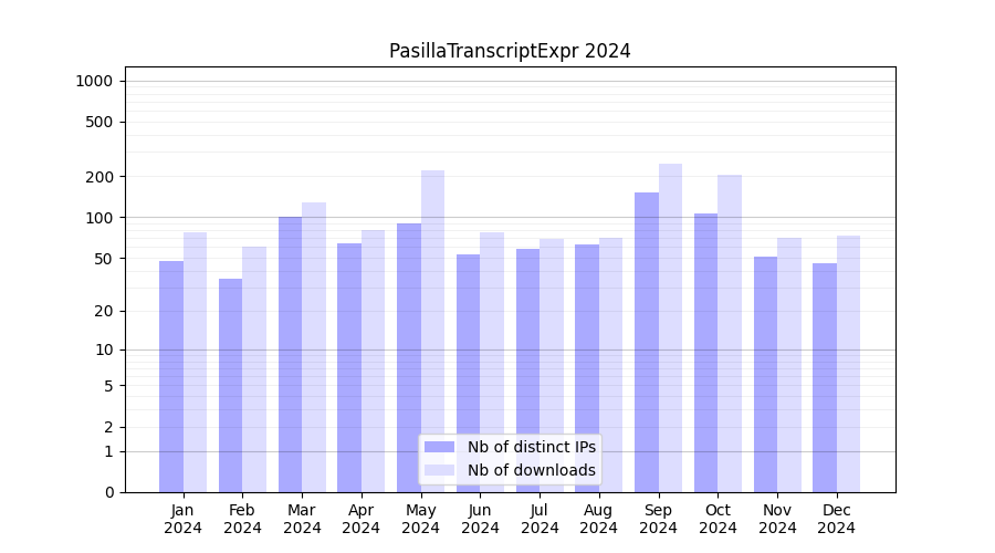 Number of downloads for experiment package PasillaTranscriptExpr, year by year, from 2025 back to 2014 (years with no downloads are omitted):
