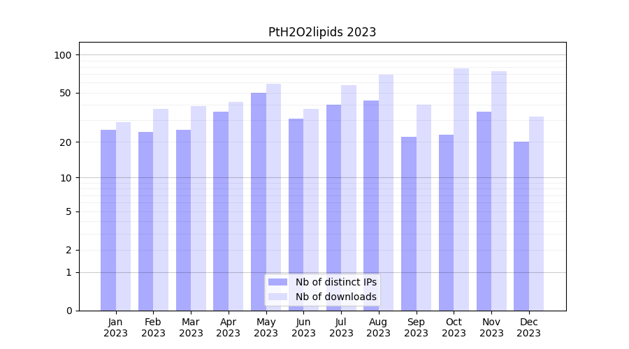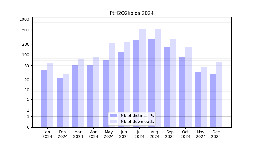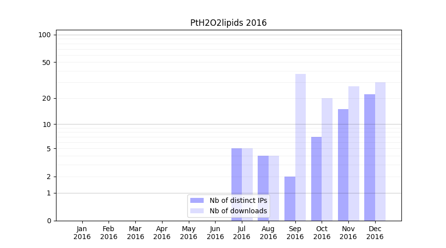 Number of downloads for experiment package PtH2O2lipids, year by year, from 2025 back to 2014 (years with no downloads are omitted):