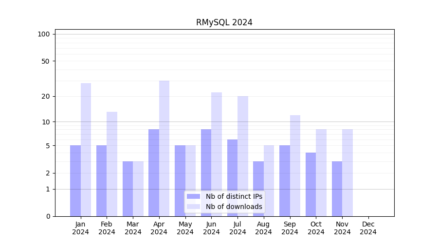 Number of downloads for experiment package RMySQL, year by year, from 2025 back to 2014 (years with no downloads are omitted):